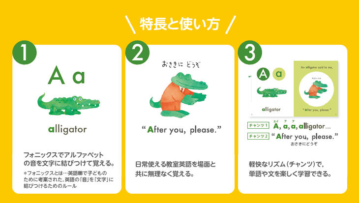 本書は,このような子どもたちならではの言語習得上の利点を生かして,英語に親しめるような構成にしました。かわいいキャラクターが表情豊かに英語の音やいろいろな表現を紹介しています。英語の入門期に学びたい大切な事項がたくさん詰まった一冊となっています。