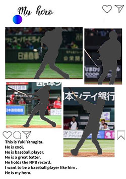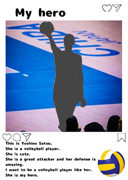 なお、今回の実践では、私が作成したワークシート(写真1)を最後に作成して、発表することをゴールとしたため、教科書の動画でUnit5のテーマが「My hero」についてであることを確認したのち、私が子どもたちの前で、ワークシートを提示しながら実際に発表のお手本を示した。