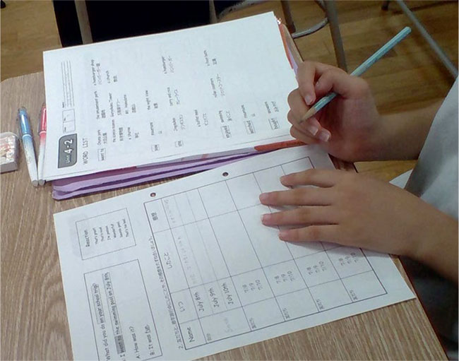 児童の中には,I enjoyed on Monday.のように目的語のない文を話すことがある。そうした間違いに気付くには,このような視覚的な支援は有効だと思う。