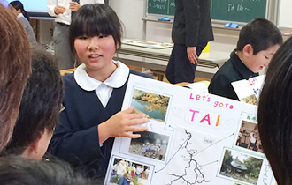 “Let’s go to TAI!” (『Hi, friends! 2』Lesson 5 “Let’s go to Italy.”)では,本単元の表現に慣れ親しんだのち,低学年が生活科「まちたんけん」のまとめとして作成し,掲示していた地図や絵などを見て,当時を思い出したりしながら自分のおすすめの場所や事柄を4つ程度選んで各自がパネルを作成した。第4時限目(最終時)は,発信の必然性をよりもたせた活動とするため,市内の住民や教員を対象にした公開授業として設定した。当日参観された40名ほどの大人(児童にとっては初対面)を相手に,児童は英語で場所を紹介したり,時には相手に質問したりしながら田井地区の紹介を行った。