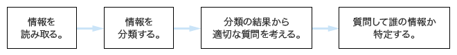 本時では,前時に整理したものを基に,的確な質問を順に並べ,友だちに尋ねることで,効率よく誰の自己紹介かを明らかにさせる。