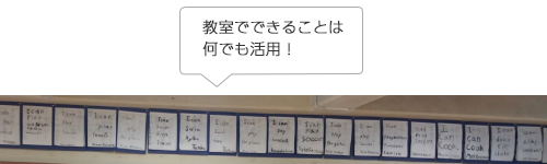 アルファベットの大文字が出てきたら助言をし,表にまとめ,いつでも振り返ることができるようクラスに掲示するようにした。繰り返し行うことで,自然と児童がアルファベットに興味をもち始め,単元が終わるころには多数のイニシャルワードを集めることができた。