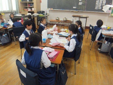 授業以外での取り組みとしては,毎日昼食の時間に英語を使って友達とコミュニケーションをとるようにしている。各グループのリーダーが主となり,テーマに基づき英語で楽しく会話をしている。この活動を通して,英語での日常会話に躊躇していた子どもが,気楽に豊かな表現力を身に着け楽しめる会話ができるようになった。また,日常生活の中でも,外国人教員や友達同士と英語でコミュニケーションをとる姿が見られるようになった。