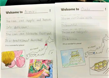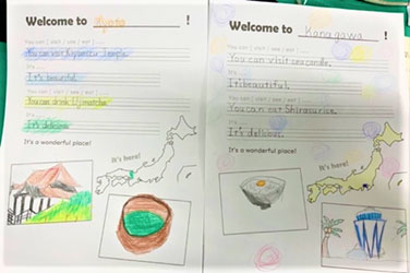 同じUnit 2でもグループによっては異なるアプローチをします。Beginnerでは教科書で基本となる表現を学び,それを「自ら使ってみる」ことに重点が置かれます。「型」となる表現を学んだ後,発話練習で音と意味を理解し,自分が紹介したい地域を話し合って決めました。その地域について「型」を参考に英文を書き,読み方を確認して発表します。英語に対して苦手意識を持つ子がいるグループですが,イラストの挿絵を一生懸命に工夫し,読み方を何度も確認して本番に臨んでいました。本番は録画して他のグループの担当教員も参照できるようにし,全児童の成長を共有しています。本校6年生は英語の得意・不得意に拘らず,学習テーマの「仕上げ」として短い発表を4年生から行っており,「6ヵ年持ち上がり制」の互いをよく知るクラスメート同士なので,「話すこと(発表)」への抵抗感は少ないのだと感じます。