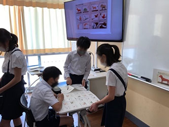 この活動では独自教材として挿絵の「〜にいるのは誰?」に呼応する動物名をイラストの裏に印字し,紙芝居ができるピクチャーカードを作成しました。例えば, “Who’s behind you?” → “She’s a cat.” や “Who’s above you?” → “It’s a bird.” のように,敢えてHe, She, Itでセリフを作り,全体をワークシートにして配布し,子どもが練習しやすいようにしました。英語が得意な子は友達に読み方を教えてあげ,動物の声を工夫しようと考える子もいました。「カメ」を調べていた子が「turtleじゃないよ,背中が膨らんでるから陸ガメtortoiseじゃない?」と説明しています。「どちらかな,2つ見つけたのはすごいね」と声がけします。他にもsquirrelやowlの発音は難しいのか,調べたノートを持って発音の確認に来る子もいました。“Oh, Mister Giraffe.” のセリフでは「misterって辞書に無かったよね」という声も聞かれ,Mr.の表記を紹介しました。Storyは「棒読みにならないように」と「 ‘位置’ のことばをはっきり発音しよう」とアドバイスしました。実際の発表では各グループで工夫した音読ができました。英語に自信のない子は声が小さくなりがちですが,仲間と一緒に教え合いながら発表ができるので安心感があります。紙芝居風に発表したグループは,リーダーシップを発揮した子が最後のセリフを全員で合わせる掛け声をかけていました。 ‘位置’ を実演したグループは見ている聞き手の笑いを誘い,発表は大いに盛り上がりました。