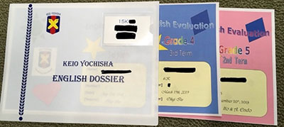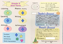 本校では中学年(2021年度より3年生も含む)から三分割の英語授業が始まり,最初の2年間は出席番号順に12名ずつ3つのグループを作ります。独自の評価表「レポートカード」は4年生以降,学期に一回発行され,学校と児童及び家庭をつなぐ役割を担っています。導入されて既に20年以上が経ちますが,手書きのコメントとシールによるマーク表示だった頃からワードで作成するようになり,時代と共に進化してきました。授業で特に頑張ったところや,何を勉強し,何ができるようになったか,子ども一人一人について担当教師が白い紙から作成します。学期毎に保護者からコメントをもらい,休み明けに再度回収してワークシートなどと共に「イングリッシュ・ドシエ」(ポケット付ファイル)に保管します。この学習記録ファイルは6年生最後の英語授業で手渡されるもので,高学年で学んだことが一冊に収められます。小学生の英語授業をA, B, Cなどの一文字で評価することは出来ません。言語スキルがこれから伸びる子どもたちですから,現状は「よく出来る」場合もあれば,取り組みに丁寧さが無く「改善しましょう」と伝える必要がある場合もあります。このレポートカードのやり取りを通して,子どもたちは「英語の先生は日頃からよく自分たちを見ている」と感じますし,保護者も「何を勉強しているかよく分かる」と応えてくれます。1学級36名の教室では見えてこない子ども一人一人の個性もよく分かりますし,英語に対する学習意欲を高める環境をつくりやすいと考えています。