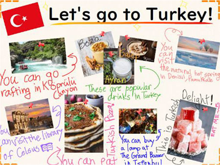 「どんな会話をしていると思う?」と聞くと,「トルコに行きたい!と話してる。」「トルコでは,トルコピザが食べれる。」「トルコに温泉ってあるの?」「このドリンク飲んでみたい。おいしそう。」「トルコに行ってみたくなった。」など,英語を聞いただけでいろいろなイメージを膨らませ,どんな会話をしているのかを推測し,思ったことを次々と発言していく。どんな会話をしているのかが分かると,「英語ではこんなふうに言うんだね。」と初めての表現との出会い。この時の子ども達の表情は嬉しそうであり,この単元ではどんな表現を学習していき,どんな活動が待っているのだろうと子ども達の期待が膨らむ。最初の段階で,単元全体を見通せたり,Goalにはどんな活動が待っているのかを子ども達が知ることができるとより楽しく学習できると考える。