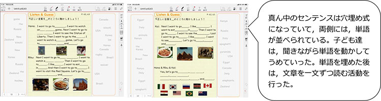 今回は穴埋め形式にし,聞こえた単語を動かして文章を完成させていくことを行った。iPadを使っての活動だったので,どの子も真剣に取り組んでいた。