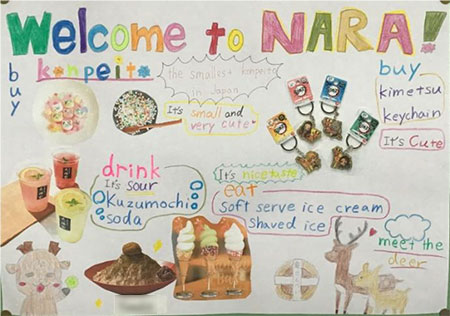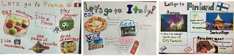 一人ひとりが自分の行きたい国を一つ決め,その国の情報をたくさん集めた。eat, drink, see, play, visit, buy についてリサーチをした後,ポスター作りを行った。ポスターを作った後は,一人ひとりがプレゼンテーションを行うため,その国の魅力を友達に伝えられるよう,個人やペアで練習する姿もあった。
