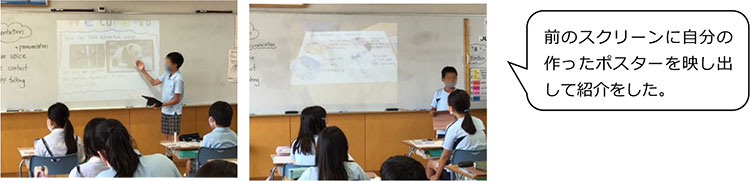 今回のプレゼンテーションは2人ずつ行った。聞いている人に,どちらの国に行きたいかをジャッジしてもらう形式にしたため,話す人はより自分の国の魅力を伝えなければいけない。どの子も”We can visit (see, eat…) ~ .”” It’s ~ .” などの表現を工夫して,その国の魅力を伝え,友達を誘うことができた。また自分の国を選んでもらえた時は,とても嬉しそうだった。