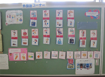 1階階段の踊り場に,外国語コーナーの掲示板を設置した。英語をテーマにしたクイズや読み物を掲示し,児童が英語の表現やアルファベット,外国の文化に興味をもてるようにした。更新は学期に2~3回で,CIR(国際交流員),ALT(外国語指導助手),地域おこし協力隊員等とテーマを打ち合わせ,製作を依頼した。
