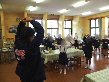 また,学校生活の中で英語の曲が流れると児童が自然と口ずさんだり,曲に合わせて体を動かしたりする様子が見られた。分からない英単語も多いと思われるが,発音をそのまま真似することで,自然な発音が身に付くことを期待した。外国語の授業時間に,校内放送でかかる曲が出てくると,児童は喜び,大きな声で歌ったり,「あの英語の歌詞はこんな意味だったんだ」と納得したりしていた。