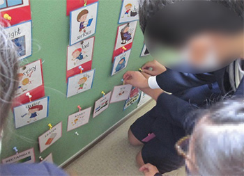 外国語コーナーの前で立ち止まっている児童をよく見かけた。特に,更新直後は,多くの児童が掲示板の前に集まり楽しんでいた。クイズ等は磁石やゴム,シールなどを使って,どのように回答したのかを児童が互いに知ることができるようにしたことで,低学年の間違いを高学年が修正したり,回答内容について話したりする様子が見られた。