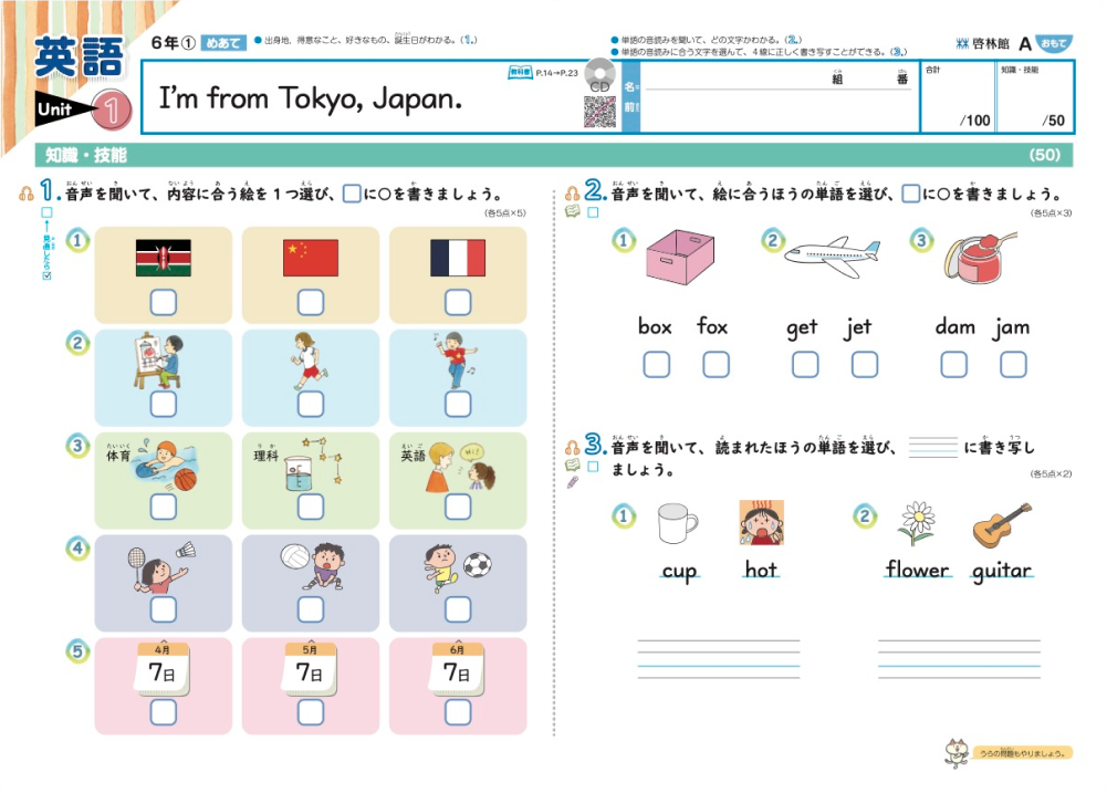 各問題の音声はQRコードから聞くことができ、児童の活動をサポートします。