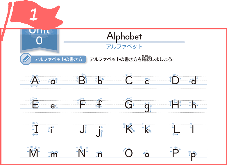 - 4年生から外国語活動を始める児童向けに、4年生も3年生と同様アルファベットのなぞり書きからはじめられるようにしています。
