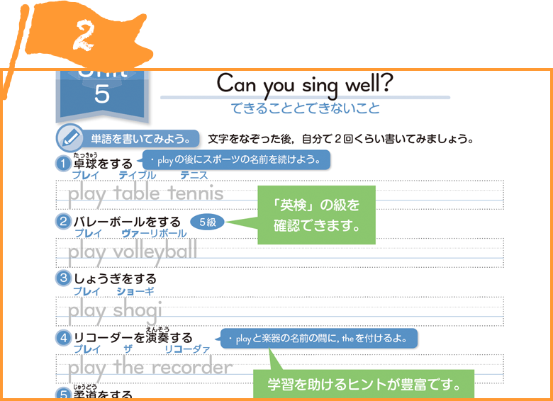 - 左ページはなぞり書きによって「単語」と「表現」の定着をはかります。右ページは英語の「文」を書いて日本語とは違った言葉のしくみを学びます。