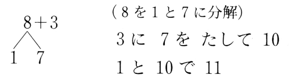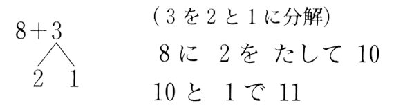 この他に,加数,被加数とも5といくつに分解して,その5 同士で10をつくるという方法もあります。五二進法といわれているものです。また,素朴な方法として,例えば,8+3 を9,10,11と数え足しによって求める方法もあります。