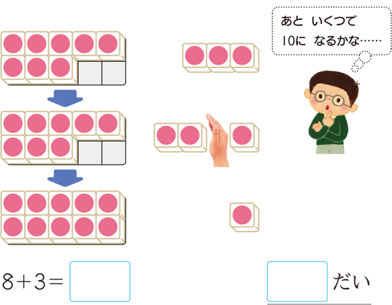 一方,被加数分解とは,次のように被加数のほうを分解して10をつくります。