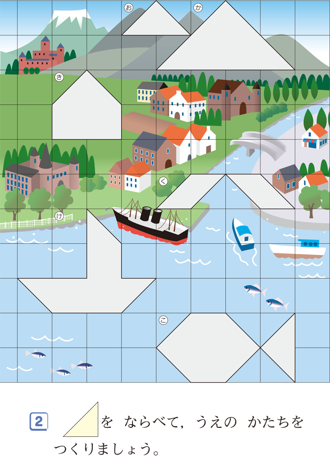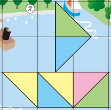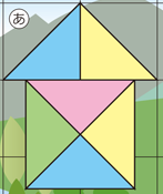 教科書では,色板何枚でどのように構成されているかを見抜かせる場を設定しており,この学習場面において,図形を分解することを経験させることができます。