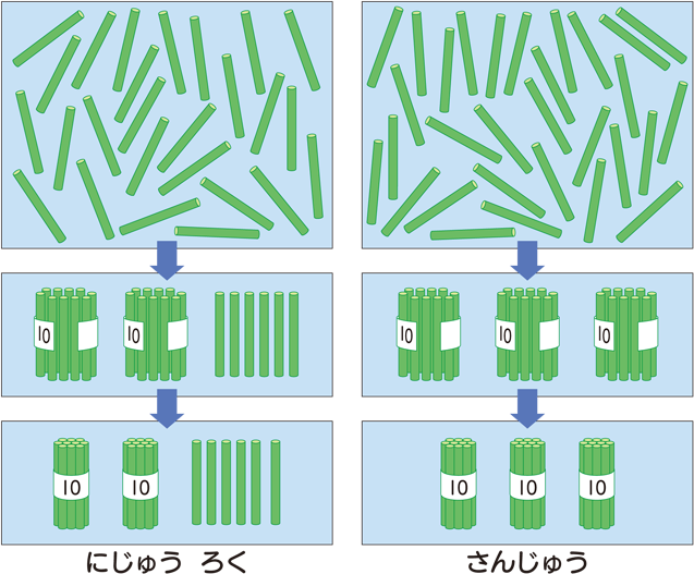 指導では,具体物を数える命数法から入り,記数法へと進めていきます。