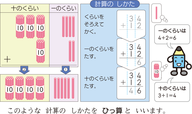 筆算は,数のかかれた形式に基づいて計算する方法です。第2学年で初めて筆算を学習し,下のようにその用語を知らせています。