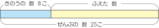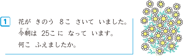 2番目の問題は,「8個から何個か増えて25個になった。つまり,25個と8個の違いが増えた花の数」というように考えて,場面は増加であるのに,25-8=17 という減法で解決します。このように,実際に答えを求める際の演算が,問題の表現とは逆になる場合を逆思考といいます。