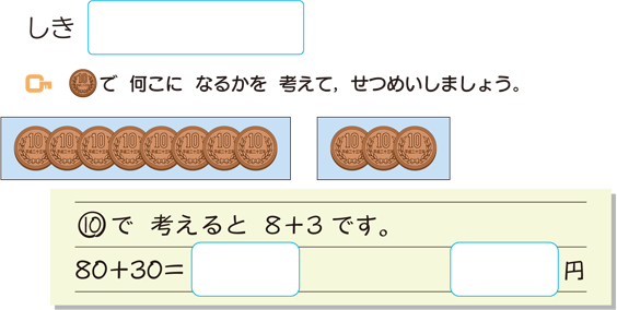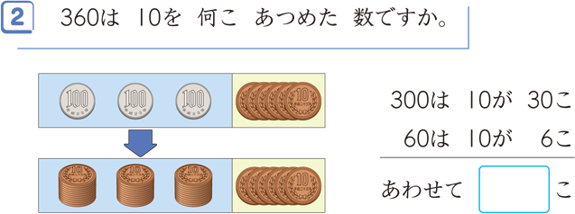 指導にあたっては,形式的にならないよう,計算棒や十円玉,百円玉など具体物を数える操作を通して理解させることが大切です。