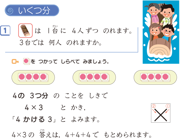 かけ算の指導では,上のように,「1だいに4人ずつ3だい分」と考え,4×3と式にかけることを理解させます。しかし,これは,かけ算の意味を理解させる上でのことであり,実際にその答えは,同数累加4+4+4で求めることになります。