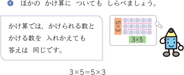 第2学年では,乗法に関して成り立つ性質として乗数と積の関係,乗法の交換法則の2つを指導することになります。