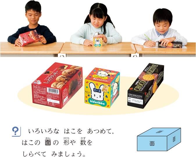 第1学年では,身の回りにあるいろいろな立体について,直観的,全体的にその特徴を捉えてきています。