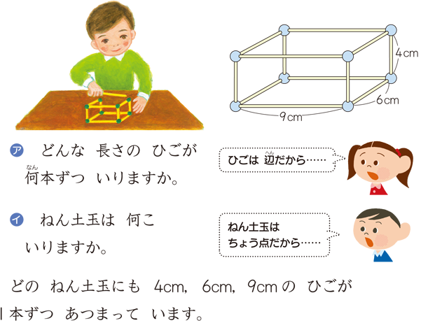 上の,ひごと粘土玉による箱づくりは,箱を構成している辺,頂点について,作業を通して理解させることができます。作業の前には箱をよく観察させ,どんな長さのひごが何本,粘土玉がいくついるかの見通しを立てさせることが大切です。