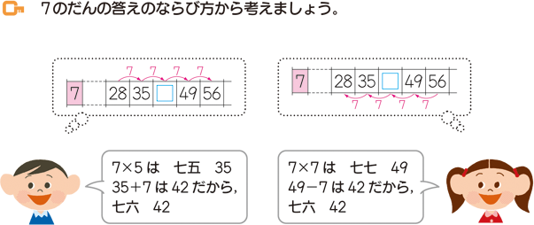 このきまりは,第2学年の九九づくりの発展として,下のように,九九の表を使って計算方法を考えさせる中で捉えさせるとよいでしょう。