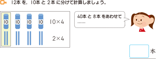 (a+b)×c=a×c+b×c については,下のように,12×4 の計算の仕方を考えさせる中で,この法則を意識させることが大切です。
