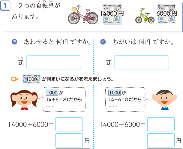 例えば,下に示す14000+6000のような計算では,数の相対的な大きさに着目すれば,既習の14+6と関連づけて計算の仕方を見つけたり,計算の確かめをしたりすることができます。