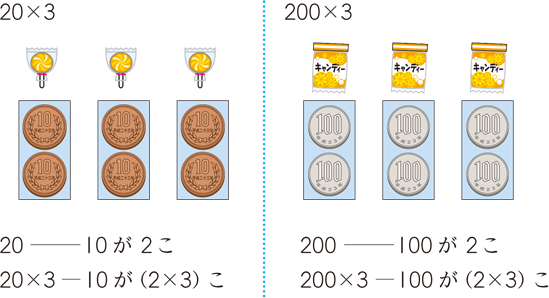 また,「何十・何百のかけ算」でも,10を単位としたり,100を単位としたりすると,20×3や200×3はいずれも「2×3」と考えることができます。