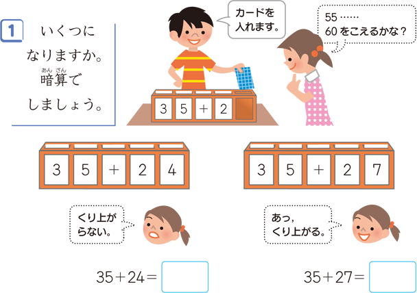 その際,途中の計算35+20の答え55をメモさせて計算させ,次第に暗算に慣れさせるということも大切なことです。