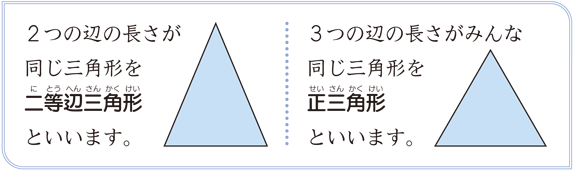 なお,二等辺三角形と正三角形の角の性質については,角の意味を理解させた後,切り取った三角形を折って,重ねて調べさせるようにします。