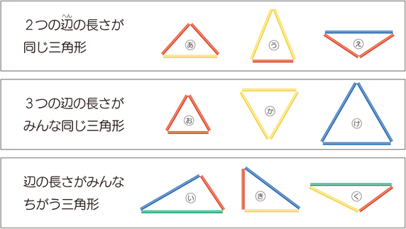 二等辺三角形と正三角形の導入では,教科書p.3にあるように,ストローやひごを使っていろいろな三角形をつくらせることが大切です。こうしてつくったいろいろな三角形を,下のように,辺の相等関係に着目して仲間分けをさせ,二等辺三角形,正三角形の概念を理解させるようにします。