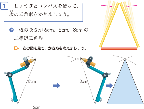 また,上図のように,二等辺三角形の作図の仕方という技能だけでなく,その意味を理解させることも大切です。