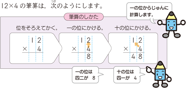 例えば,かけ算の筆算の指導では,下の例のように,一の位から順に計算するという手順を見つけさせ,かけ算の筆算のアルゴリズムをまとめるようにするとよいのです。