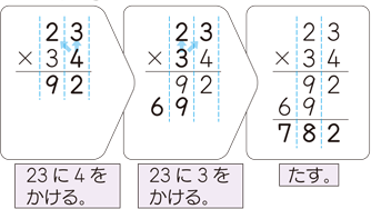 1.位をそろえてかく→2.一の位にかける→3.十の位にかける→4.あわせてかく