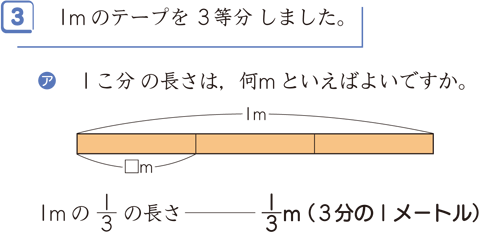 分数の導入では,1m単位で測ったときの端数の表し方を考えさせる場面で,1mの「2分の1」や「3分の1」という分割分数を知らせ,その後,1/2m,1/3mという量を表す分数を指導します。