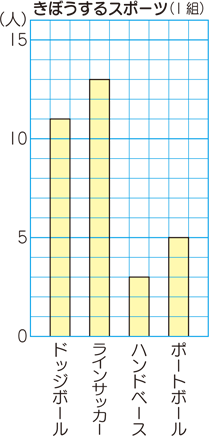 なお,棒グラフは,棒の長い順にかくと比較しやすく,見た目もきれいですが,時間的経過の決まっているものや配列の順序が決まっているものもあり,この学年では,その判断が難しいようです。指導では,これに触れる程度とし,実際には与えられた項目順にかかせるとよいでしょう。