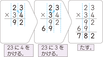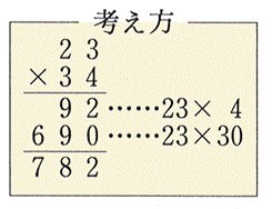 例えば,23×34の計算では,右のように,23×4の積92と23×30の積690をそれぞれ求め,最後にそれらを加えて全体の積を求めます。