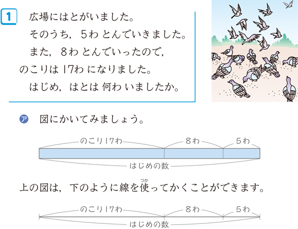 いろいろな意味をもつ数量を線分に置き換えることは,抽象度が高く,線分図をかくことは児童にとって必ずしも易しいことではありません。そこで,教科書では,第2学年で文章題を解く際に,テープ図を段階を踏んで指導し,第3学年での線分図への移行が無理なくできるようにしています。