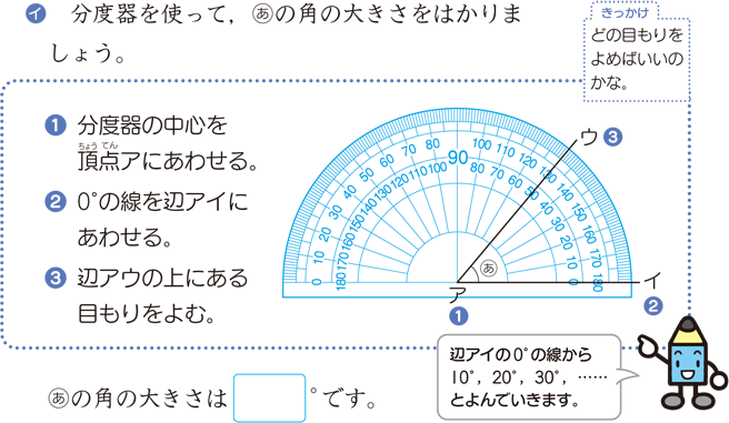 分度器の扱いの中で児童がつまずきやすいのは,目盛りのよみ方です。