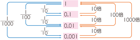 こうした小数の意味は,1/10の位(小数第1位)までについては第3学年で学習し,第4 学年ではこれらの既習事項を前提に,1/100の位(小数第2位),1/1000の位(小数第3位)の表し方を学習することになっています。そして同時に,次のような1と0.1,0.01,0.001の単位間の関係などを調べ,小数の仕組みを明らかにしていきます。