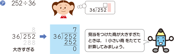 この方法は,252,36の一の位を切り捨てて250÷30と見て,除法では「被除数,除数を同じ数でわっても商は変わらない」という性質を使って25÷3の計算に帰着させて仮商をたてるやり方です。この方法では,仮商を1ずつ小さく修正して真商を見出すことになります。