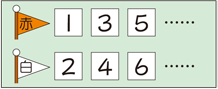 11,12のカードをひいた人は,赤組と白組のどちらにはいりますか。