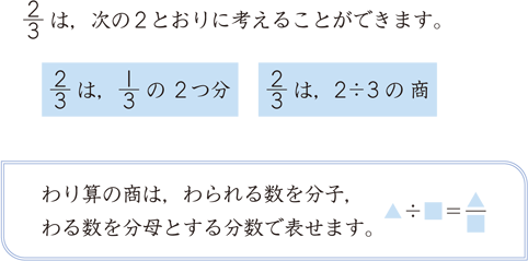 第二義は,「2を3でわったもの(2÷3)」となります。下の例で説明があるように,わり算の商としての意味があり,商の分数ともいわれています。